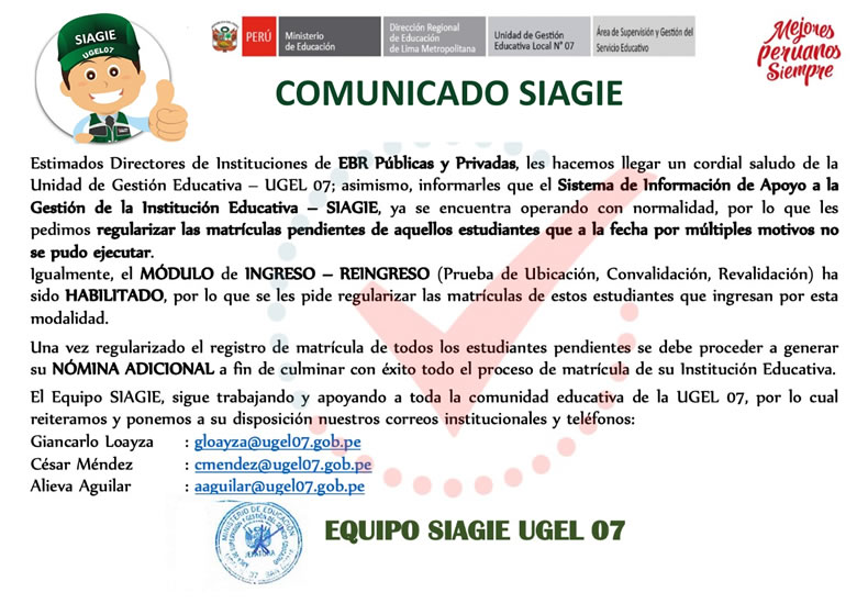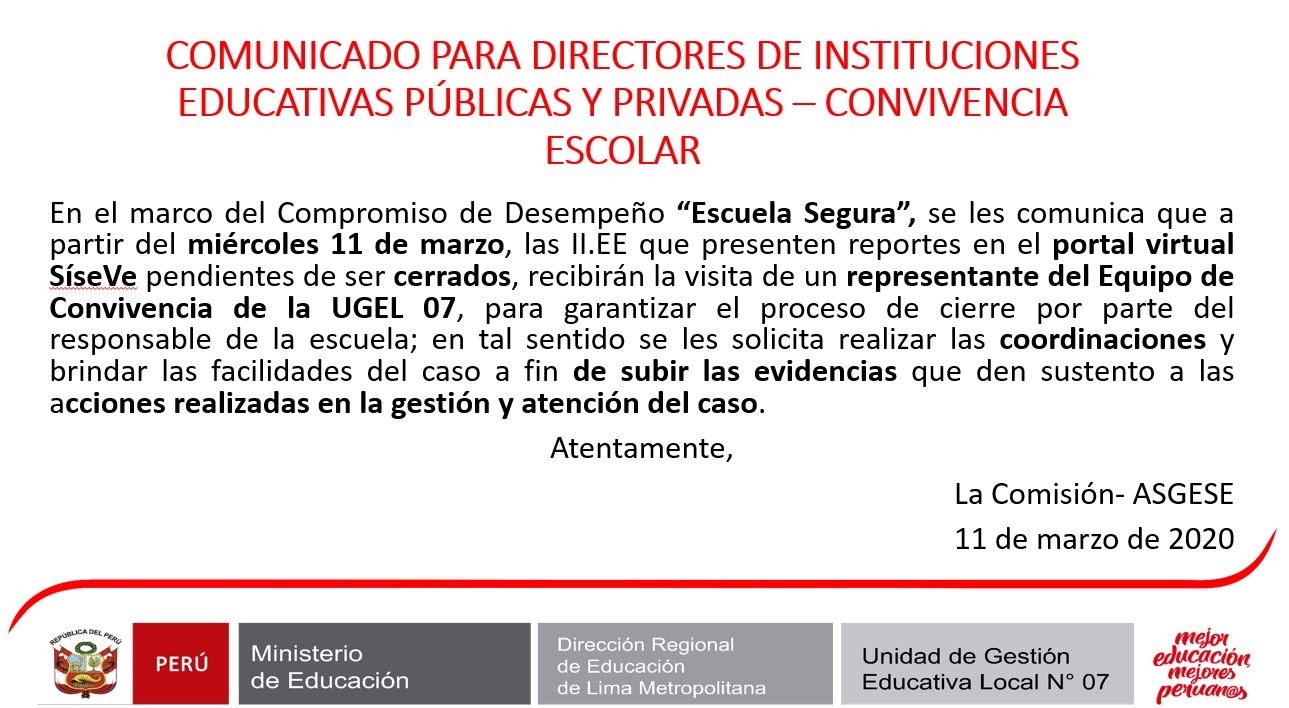 Reiteramos implementar acciones de mejora para optimizar la asistencia de estudiantes y docentes en el marco de la Buena Práctica de "Vamos Juntos a la Escuela" - Ugel 07 en las II.EE. de EBR-EBE-EBA del ámbito de la UGEL 07
