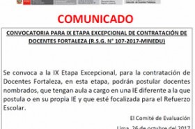 Comunicado: Convocatoria para IX etapa Excepcional de Contratación de Docentes Fortaleza (R.S.G. N° 107-2017-MINEDU)