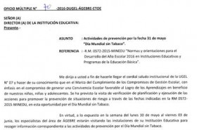 Se hace de conocimiento a los Sres. directores de las instituciones educativas de nuestra jurisdicción que, en la semana del lunes 30 de mayo al viernes 03 de junio, los especialistas del área de AGEBRE estarán visitando las instalaciones de las Instituciones Educativas para recoger información correspondiente a las actividades de prevención por el Día Mundial sin Tabaco.