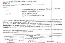 Informamos a los directores de las II.EE. de nuestra jurisdicción que el Minedu viene implementando sistemas de evlauación en las áreas de comunicación y matemática, por ello la UMC ha emitido el kit de evaluación de las áreas mencionadas para el 2do grado de Educación Secundaria para ser aplicado en las II.EE. Públicas y Privadas, en el marco de la ECE 2016.
