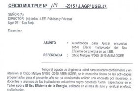 Se hace de conocimiento que dentro de las actividades programadas para el presente año se ha considerado aplicar una encuesta por muestreo, a docentes y alumnos de las II.EE. cuyos docentes fueron capacitados en el Taller sobre el Uso Eficiente de la Energía, realizado en el mes de Julio y evaluar el efecto multiplicador. En tal sentido, se solicita dar las facilidades correspondientes al personal del MINEM para aplicar la encuesta en las II.EE. seleccionadas indicadas en el anexo del Oficio Múltiple 119. Revisar el Oficio Múltiple haciendo click en DESCARGAR.