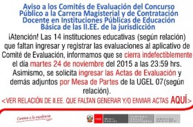 ¡Atención! Comunicamos a las 14 instituciones educativas (según relación) que faltan ingresar y registrar las evaluaciones al aplicativo de Comité de Evaluación, que se cierra indefectiblemente el día martes 24 de noviembre del 2015 a las 23:59 hrs.