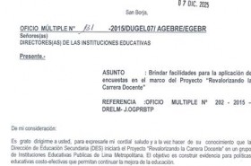 Informamos a los directores de las Instituciones Educativas el Oficio Múltiple 131 referido a la aplicación de encuestas en el marco del Proyecto «Revalorizando la Carrera Docente» y las facilidades que se puedan brindar a los aplicadores en las instituciones educativas.