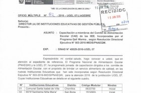 Se hace de conocimiento que se realizará la Capacitación a miembros del Comité de Alimentación Escolar (CAE) de las II.EE. incorporadas por el Programa Qali Warma, para la atención 2016 de la jurisdicción UGEL 07, cuyas instituciones se detallan en el siguiente oficio >> HACER CLICK AQUÍ.