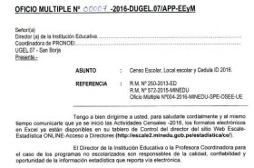 Se hace de conocimiento a los sres. directores de las II.EE. de nuestra jurisdicción que se dió inicio a las actividades censales 2016. Los formatos electrónicos en excel ya se encuentran disponibles en su Tablero de Control del director del sitio Web Escale – Estadísitica ONLINE – Acceso a Directores (http://escale2.minedu.gob.pe/estadistica/ce/).