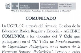 Comunicamos a los docentes del V Ciclo que participaron del III Taller de Fortalecimiento de Capacidades Pedagógicas en el marco de la Estrategia de Soporte Pedagógico, llevado a cabo del 02 al 06 de noviembre del 2015 en la Casa Belén, que el día viernes 30 de noviembre se efectuó el depósito por concepto de movilidad local a las cuentas de ahorro del Banco de la Nación que proporcionaron a la organización.