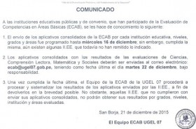 Atención con el siguiente comunicado a las instituciones educativas públicas y de convenio, que han participado en la Evaluación de Competencias en Áreas Básicas (ECAB): hacer click en DESCARGAR.