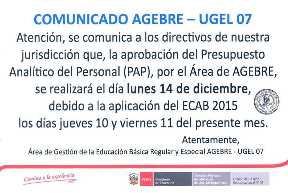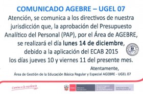 Se hace de conocimiento a los directivos de las II.EE. de la UGEL 07 que, la Aprobación del PAP por el Área de AGEBRE se realizará el día lunes 14 de diciembre, debido a la aplicación del ECAB 2015 los días jueves 10 y viernes 11 del presente mes.