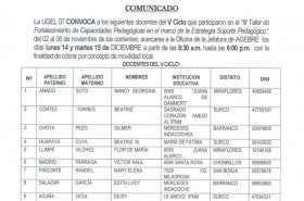 Atención, se hace un llamado a los siguientes docentes a acercarse a la oficina de la jefatura de AGEBRE los días 14 y martes 15 de diciembre, de 8:30am. a 6:00pm., a fin de cobrar por concepto de movilidad. Ver la relación en el siguiente ENLACE.