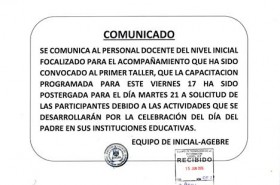 Se comunica al personal docente del nivel inicial focalizado para el acompañamiento que ha sido convocado al primer taller, que la capacitación programada para este viernes 17 ha sido postergada para el día martes 21 a solicitud de las participantes debido a las actividades que se desarrollarán por la celebración del día del padre en sus instituciones educativas.