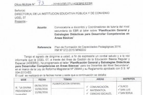 Se hace de conocimiento que, el Área de AGEBRE de la UGEL 07, ha programado el taller «Planificación General y Estrategias Didácticas para Desarrollar Competencias en Áreas Básicas» para los docentes del nivel secundaria, la cual se realizará en fechas y horas señaladas en el Oficio Múltiple 073-2016.