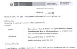 Volver a Avisos AvisosConvocatoria a Mesa de Trabajo con equipo directivo y docente coordinador del área de Comunicación para el fortalecimiento de la competencia lectora – Nivel secundaria.