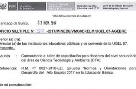 Convocatoria a taller de capacitación para docentes del nivel secundaria del área de Ciencia Tecnología y Ambiente (CTA).