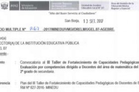 Volver a AvisosAvisosConvocatoria al III Taller de Fortalecimiento de Capacidades Pedagógicas en Evaluación por competencias dirigido a Docentes del área de matemática del 1° y 2° grado de secundaria.