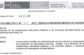 Convocatoria al taller de profundización de los criterios e instrumentos de evaluación de desempeño docente, dirigido a los docentes de las instituciones educativas públicas y de convenio sujeto a evaluación ordinaria de desempeño docente tramo I.