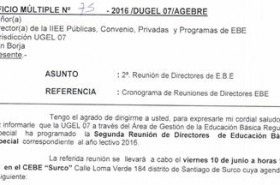 Se hace de conocimiento que el Área de AGEBRE de la UGEL 07 ha programado la Segunda Reunión de Directores de Educación Básica Especial correspondiente al año 2016, la cual se llevará a cabo el viernes 10 junio a horas 9:15 am en el CEBE Surco (Calle Loma Verde 184, distrito de Santiago de Surco).