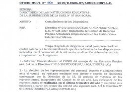 Se hace de conocimiento a los sres. directores de las II.EE. de la UGEL 07 el Oficio Múltiple 150 referido al cumplimiento de las disposiciones indicadas en los documentos: Directiva N°010-2015/DUGEL07/J-AGA/CONTAB/-LC y Reglamento de Gestión de Recursos Propios Actividades Empresariales en las II.EE. Públicas.