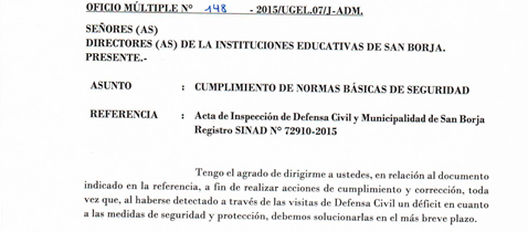 Se hace de conocimiento a los sres. directores de las II.EE. del distrito de San Borja, que en relación al Acta de inspección de Defensa Civil y Municipalidad de San Borja, a fin de realizar acciones de cumplimiento y corrección, al haberse detectado a través de las visitas de Defensa Civil, un déficit en cuanto a las medidas de seguridad y protección, debemos solucionarlas en el más breve plazo, por lo que a partir de la fecha se solicita muy urgentemente en el plazo de cuarenta y ocho horas nos brinde la información de las falencias que pudiera tener sus respectivas instituciones educativas.