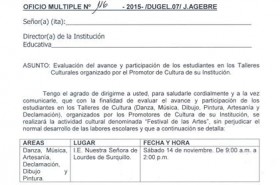 Comunicamos a los directores de las II.EE. de nuestra jurisdicción y comunicarle, que con la finalidad de evaluar el avance y participación de los estudiantes en los Talleres de Cultura, se realizará la actividad cultural «Festival de las Artes», en la I.E. Nuestra Señora de Lourdes del distrito de Surquillo, el día sábado 14 de noviembre de 9:00am. a 2:00pm, motivo por el cual el docente Promotor de Cultura deberá asistir con su delegación a la actividad programada.