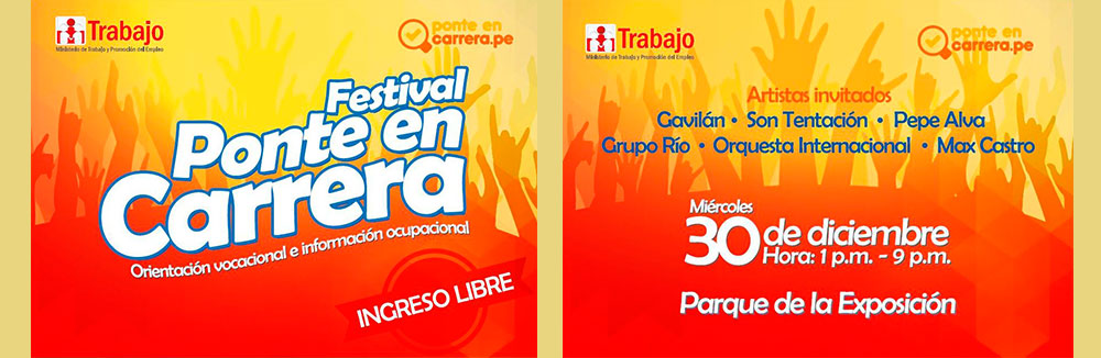 Se invita a todos los estudiantes de nuestra jurisdicción al Festival Ponte en Carrera – Orientación Vocacional, a realizarse el día 30 de diciembre del presente año, a horas 1:00p.m. en el Parque de la Exposición.