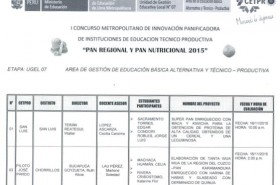 Atención con el cronograma de evaluación de los siguientes CETPRO para el I Concurso Metropolitano de Innovación Panificadora de instituciones de Educación Técnica Productiva «Pan Regional y Pan Nutricional 2015» en su Etapa Ugel 07.