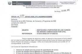 Se hace de conocimiento la siguiente información acerca de la capacitación de los cursos de verano convocados por el Centro Peruano de Audición y Lenguaje CPAL. Para ello se solicita enviar los nombres y apellidos de un docente por CEBE que desee participar en la capacitación, para lo cual deben de acercarse con la especialista de EBE para entregar el formulario de inscripción, de igual forma para los interesados en las becas de Maestría.