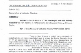 Hacemos de conocimiento que la UGEL 07, en coordinación con la DRELM, ha programado realizar la Maratón Familiar 3K «En familia por una vida activa y sana», a llevarse a cabo el día domingo 22 de mayo, de 10:00 am. a 12:00 m. en cada uno de los núcleos focalizados y con la participación de los estudiantes, padres de familia, docentes de aula, docentes del Plan de Fortalecimiento de Educación Física y directivos de su institución. Se agradecerá difundir y realizar las coordinaciones del caso a fin de garantizar el cumplimiento y congregar a la comunidad educativa en pleno.