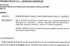 Se hace de conocimiento a los directores de las II.EE. que el material para el docente es material no fungible (guías , manuales, CDs, textos y otros) los cuales deben de ser custodiados y conservados en buen estado hasta la próxima reposición, motivo por el cual deben ser devueltos por los docentes al finalizar el año escolar y deben de permanecer al sistema de bancos de libros. A la vez debe de realizar un inventario rotulando en la contratapa según el anexo indicado en el Oficio Múltiple 035.