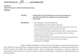 Se informa a los sres. directores de las Instituciones Educativas de la UGEL 07 que de acuerdo al Oficio Múltiple remitido por el Director General de Calidad de la Gestión Escolar, sobre la problemática presentada en diversos medios de comunicación sobre hechos en los que se observa a docentes maltratando a estudiantes, especialmente de los primeros grados; es necesario que las II.EE. garanticen el respeto al derecho que tienen los niños, niñas y adolescentes a su integridad moral, psiquica, física y bienestar integral.