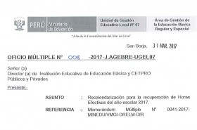 Volver a Avisos AvisosRECALENDARIZACIÓN PARA LA RECUPERACIÓN DE HORAS EFECTIVAS DEL AÑO ESCOLAR 2017