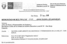 Reitera cumplimiento de asistencia y permanencia en la UGEL. 07 – San Borja