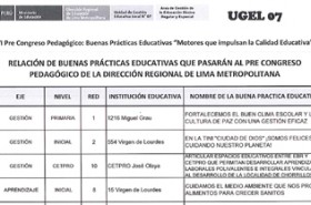 Relación de Buenas Prácticas Educativas que pasarán al Pre Congreso Pedagógico de la Dirección Regional de Lima Metropolitana