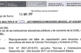 Volver a Avisos AvisosReprogramación de taller de capacitación para docentes del nivel secundaria del área de Ciencia Tecnología y Ambiente (CTA)