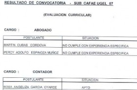 Comunicamos a los postulantes los resultados de la Evaluación Curricular de la convocatoria SUBCAFAE-UGEL07: HACER CLICK AQUÍ.