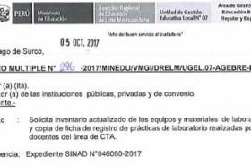 Volver a Avisos AvisosSolicita inventario actualizado de los equipos y materiales de laboratorio y copia de ficha de registro de prácticas de laboratorio realizadas por los docentes del área de CTA.