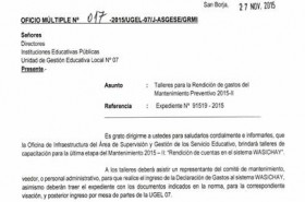 A los talleres deberá asistir un representante del comité de mantenimiento, veedor o personal administrativo, para que realice el ingreso de la Declaración de Gastos al sistema WASICHAY, así mismo deberán traer el expediente con los documentos indicados en la norma, para la correspondiente visación y posterior ingreso por Mesa de Partes de la UGEL 07.