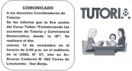 Se informa a los docentes coordinadores de Tutoría, que la 8va sesión del Curso Taller: «Fortaleciendo las acciones de Tutoría y Convivencia Democrática desde la I.E.» se realizará el día jueves 12 de noviembre en el horario de 2:00pm. en el Auditorio de la UGEL N°07, sito en Av. Álvarez Calderón N° 492 Torres de Limatambo – San Borja.