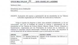 Comunicamos a los directores de las II.EE. de nuestra jurisdicción y comunicarle, que con la finalidad de evaluar el avance y participación de los estudiantes en los Talleres de Cultura, se realizará la actividad cultural «Festival de las Artes», en la I.E. Nuestra Señora de Lourdes del distrito de Surquillo, el día sábado 14 de noviembre de 9:00am. a 2:00pm, motivo por el cual el docente Promotor de Cultura deberá asistir con su delegación a la actividad programada.