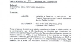 Informamos a nuestros directores de las II.EE. de la UGEL 07 que la I.E. San Pedro de Chorrillos, en coordinación con la UGEL 07, está organizando el proyecto «Conociendo mis finanzas mejoramos nuestra calidad de vida», el cual fortalecerá a los docentes en temas de Educación Financiera. Para ello invitamos a los docentes a participar de las ponencias «Las finanzas en el cole», la cual se realizará según el horario indicado en el Oficio Múltiple 117. Ver Oficio Múltiple haciendo CLICK AQUÍ.
