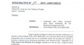 Leer másSe hace de conocimiento que dentro de las actividades programadas para el presente año se ha considerado aplicar una encuesta por muestreo, a docentes y alumnos de las II.EE. cuyos docentes fueron capacitados en el Taller sobre el Uso Eficiente de la Energía, realizado en el mes de Julio y evaluar el efecto multiplicador. En tal sentido, se solicita dar las facilidades correspondientes al personal del MINEM para aplicar la encuesta en las II.EE. seleccionadas indicadas en el anexo del Oficio Múltiple 119. Revisar el Oficio Múltiple haciendo click en DESCARGAR.