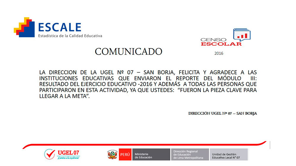 La Dirección de la UGEL N° 07 – San Borja, Felicita, y Agradece a las Instituciones Educativas que enviaron el reporte del módulo III: Resultado del Ejercicio Educativo – 2016 y además a todas las personas que participaron en esta actividad, ya que ustedes: “Fueron la pieza clave para llegar a la meta”.