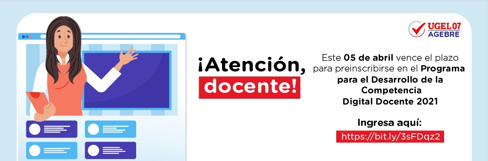 - Te invitamos a participa en el “Programa para el Desarrollo de la Competencia Digital Docente 2021”, dirigido a todos los docentes de Educación Básica Regular (EBR), Educación Básica Especial (EBE) y Educación Básica Alternativa (EBA).