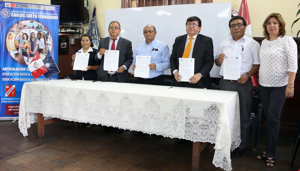 Los convenios fueron firmados por la directora del CEBA “José María Eguren”, Martina Paipay Ybañez; por Franquin Valdivieso Cornetero del CEBA “Mercedes Indacochea”; del director Manuel Vásquez Ysla de la IE “Enrique Arnaez Naveda” y en representación del CETPRO “Carlos Cueto Fernandini”, por el director Moisés Rojas Cachuan.