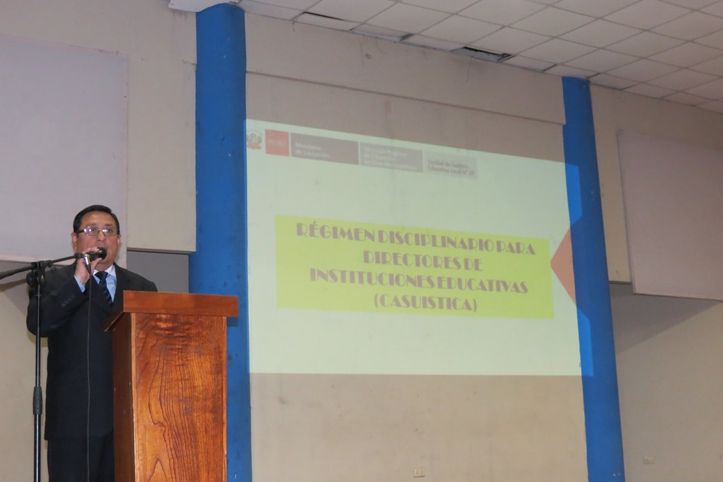En esta oportunidad los asistentes recibieron orientación sobre la “Responsabilidad en la Administración Pública”, ponencia que estuvo a cargo del Abg. Jorge Luis Manrique Campomanes, jefe del Órgano de Asesoría Jurídica de la UGEL N° 07.
