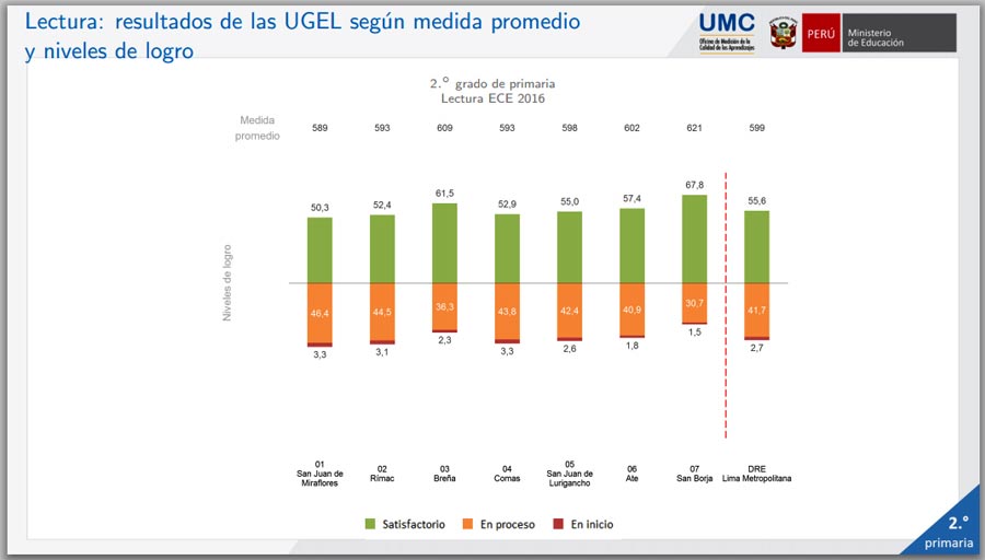 En ese mismo sentido, las cifras de Lima Metropolitana en Lectura, los resultados fueron los siguientes: en el nivel satisfactorio se alcanzó el 55,6; en proceso se alcanzó el 30,7 y de proceso inicial el 1,5. Así mismo, la población estudiantil de la UGEL 07 volvió a presentar cifras alentadoras, en las que alcanzó: Nivel satisfactorio 55,6; en proceso se logró el 41,7; y finalmente el 2,7 estar aun en nivel de logro inicial. Estos resultados están expuestos en el cuadro de la página 23 del informe (enlace ECE 2016 Lima Metropolitana)