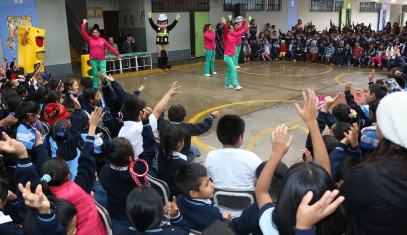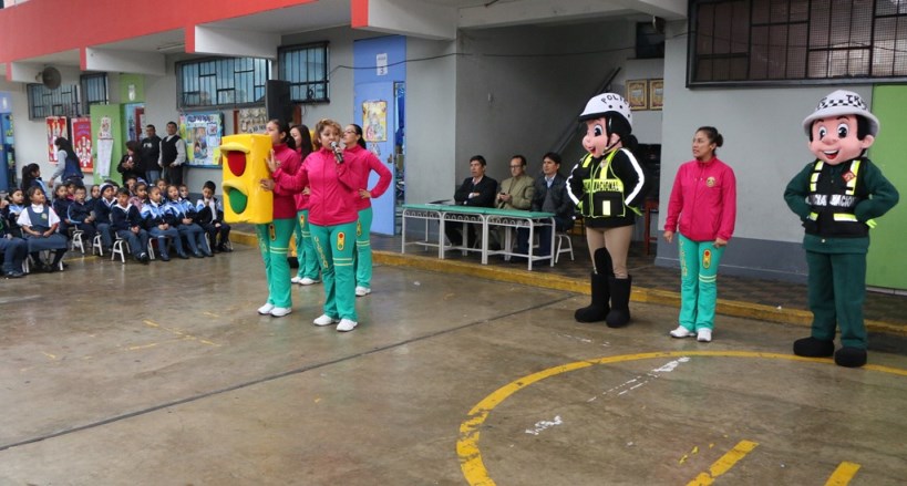 Las integrantes de la Policía Nacional recrearon con alegres canciones y juegos el respeto a las señales de tránsito. Siendo los muñecos “Polito” y “Polita” los que se encargaron de enseñar a los niños.