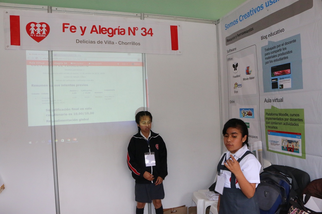 Las pequeñas alumnas de la I.E. Fe y Alegría, Samira Romero y Gabriela Ponce, guiadas por su docente en TIC, Alicia Alberca Reyna, explicaron con mucha sencillez y conocimiento el trabajo realizado en el curso de Tecnologías de la Información y la Comunicación denominado “Somos creativos usando las TICs”.