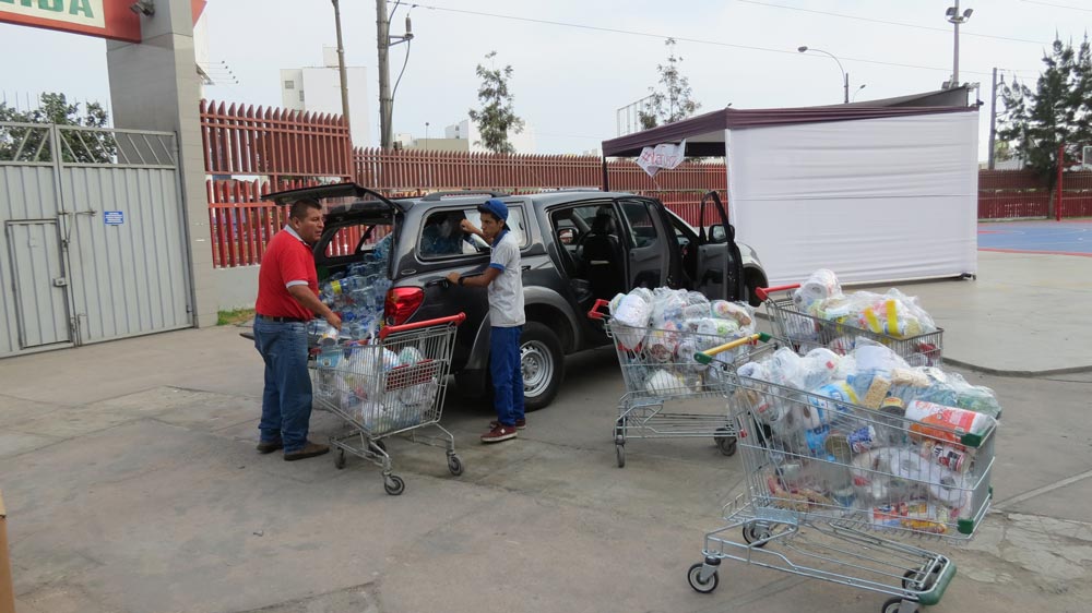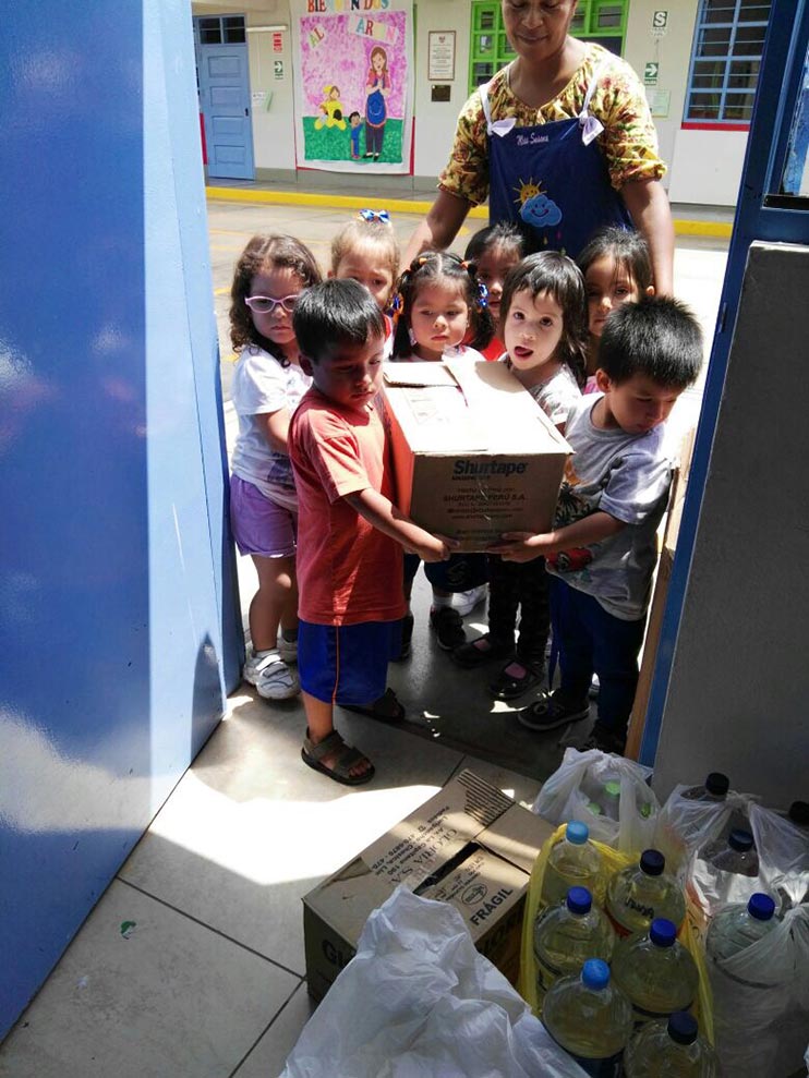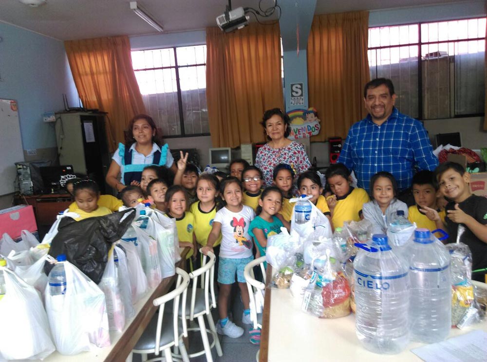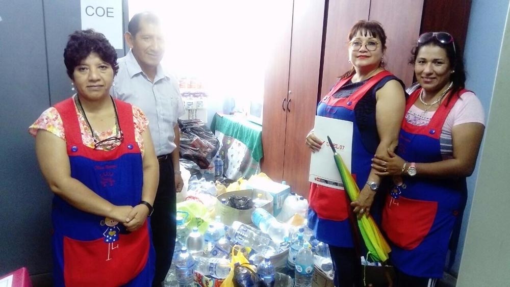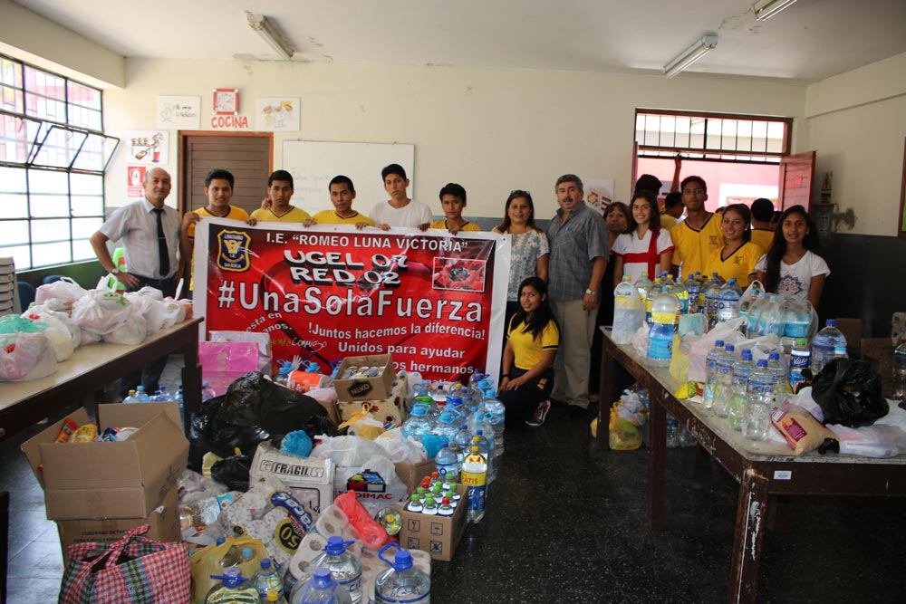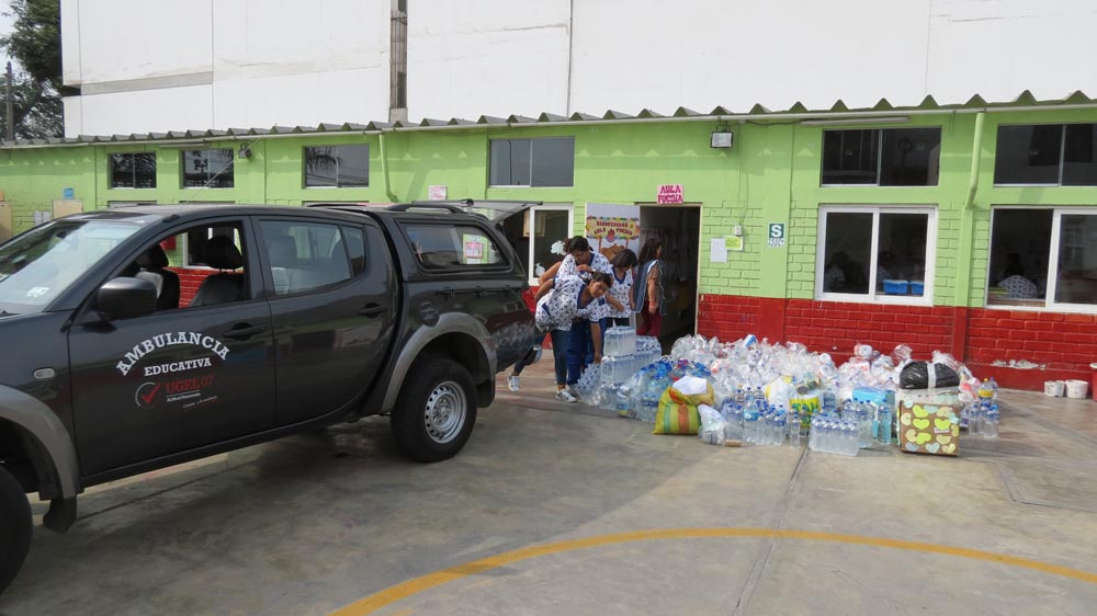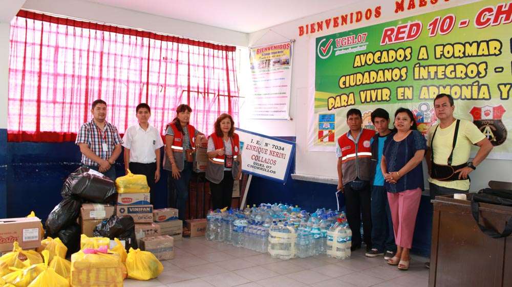 Las redes educativas de la UGEL 07, llenos del espíritu de la solidaridad, han recolectado conservas, leche, arroz, azúcar, menestras, fideos, artículos de limpieza, agua embotellada, medicinas, papel, toallas higiénicas, pañales, juguetes, jabones, dentífricos, utensilios, entre otros artículos de primera necesidad y que ayudarán a las personas afectadas.