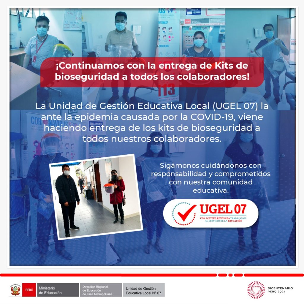 La Unidad de Gestión Educativa Local (UGEL 07) en el marco de la epidemia causada por la COVID-19 y en cumplimiento de la RM Nº972-2020-MINSA (Lineamientos del plan de vigilancia, prevención y control de la salud de los trabajadores con riesgo a exposición a SARS COV -2), viene haciendo entrega de los kits de bioseguridad a todos los colaboradores que laboran de manera semipresencial en nuestras diferentes sedes.