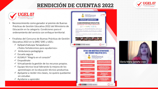 La UGEL 07, representada por los jefes de sus diferentes áreas, presentó la rendición de cuentas del año 2022. El evento se transmitió mediante la página web y las redes sociales, y tuvo el objetivo de comunicar las acciones realizadas para asegurar el desarrollo de la educación a lo largo del año anterior.